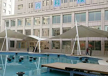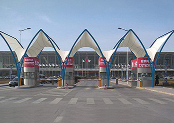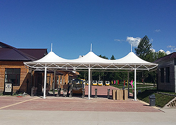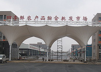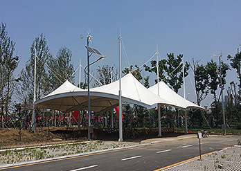 出入口膜结构打破了纯直线建筑风格的模式,以其独有的优美曲面造型,简洁、明快、刚与柔、力与美的完美组合,呈现给人以耳目一新的感觉,同时给建筑设计师提供了更大的想象和创造空间