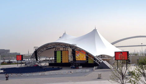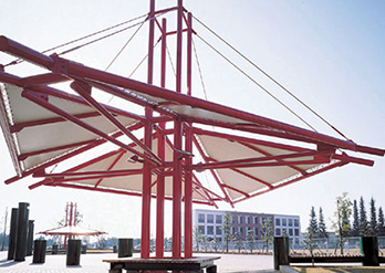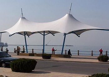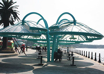 膜结构景观凉亭具有高抗张拉强度,高抗撕裂强度,材料尺寸的稳定性,即对伸长率的要求,抗弯折性,要有一定的柔软度,要有较高的透明度和放射太阳光的能力
