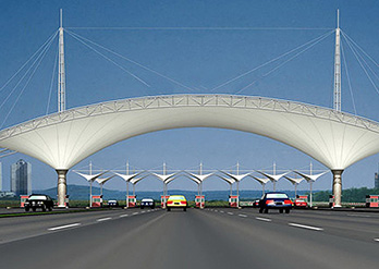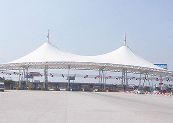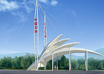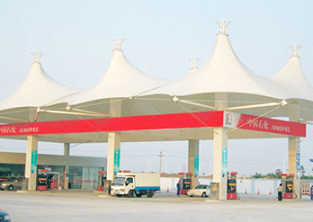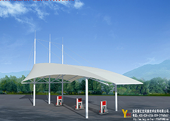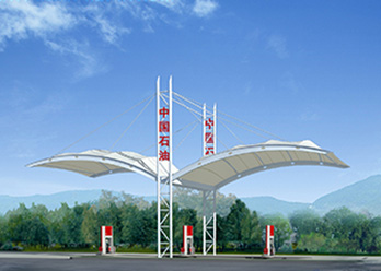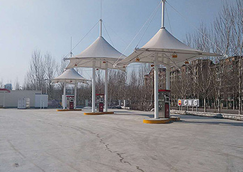 加油站计量站膜结构具有全面的外遮阳功能,其遮阳布所具有的特殊防紫外线功能,不仅使车辆、人体免受紫外线的侵袭,而且大大延长了加油站设备的使用寿命