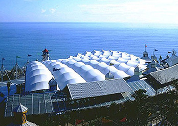 膜结构房顶棚是以建筑膜材料为主体,利用这种膜结构的张拉作用,与支承构件形成的一个统一的结构整体屋面,这样的整体就叫做膜结构屋面,通俗的角度来讲,也可以叫做膜结构房顶棚