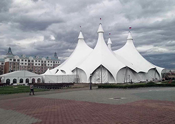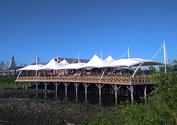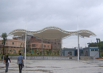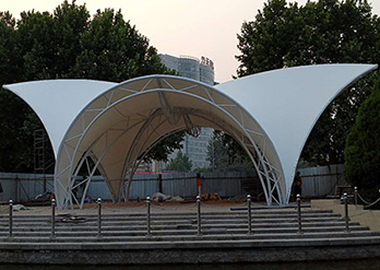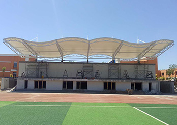 膜结构罩棚的跨度大是特点之一,在跨度大的建筑中需要对建筑的设计及膜材选用非常严格,由空气压力支撑膜面,或是利用柔性钢索或刚性骨架将膜面绷紧,从而形成具有一定刚度并能覆盖大跨度结构体系