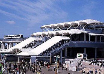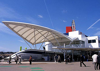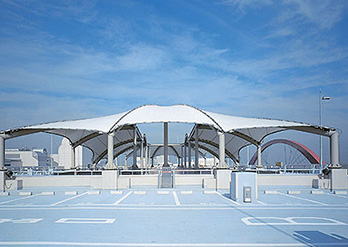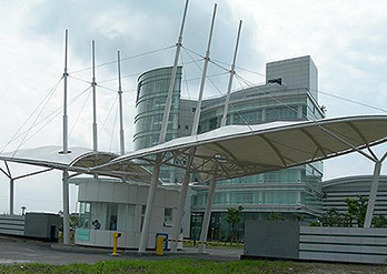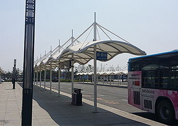 出入口膜结构打破了纯直线建筑风格的模式,以其独有的优美曲面造型,简洁、明快、刚与柔、力与美的完美组合,呈现给人以耳目一新的感觉,同时给建筑设计师提供了更大的想象和创造空间